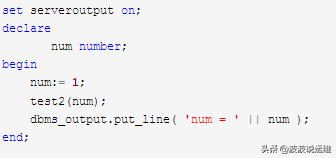 set serveroutput on; --没这句话,看不到dmbs_output信息。 declare num number; begin num:= -1; test; dbms_output.put_line; end;