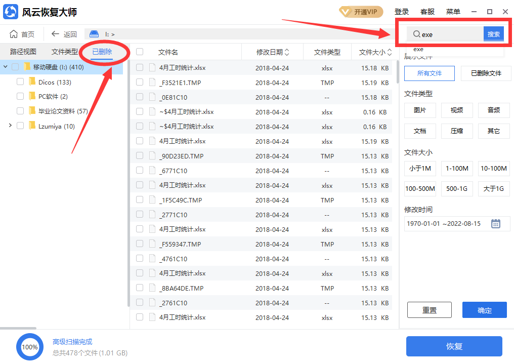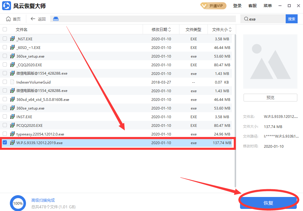 这个方法在扫描时花费时间会比较多,但是恢复的文件是很多完整的,如图找到exe后缀文件,恢复即可。
