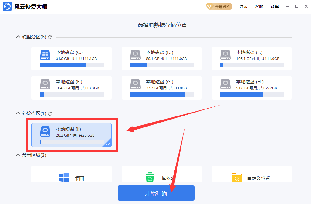 打开风云恢复大师,选择对应位置进行扫描即可,这里以U盘为例。
