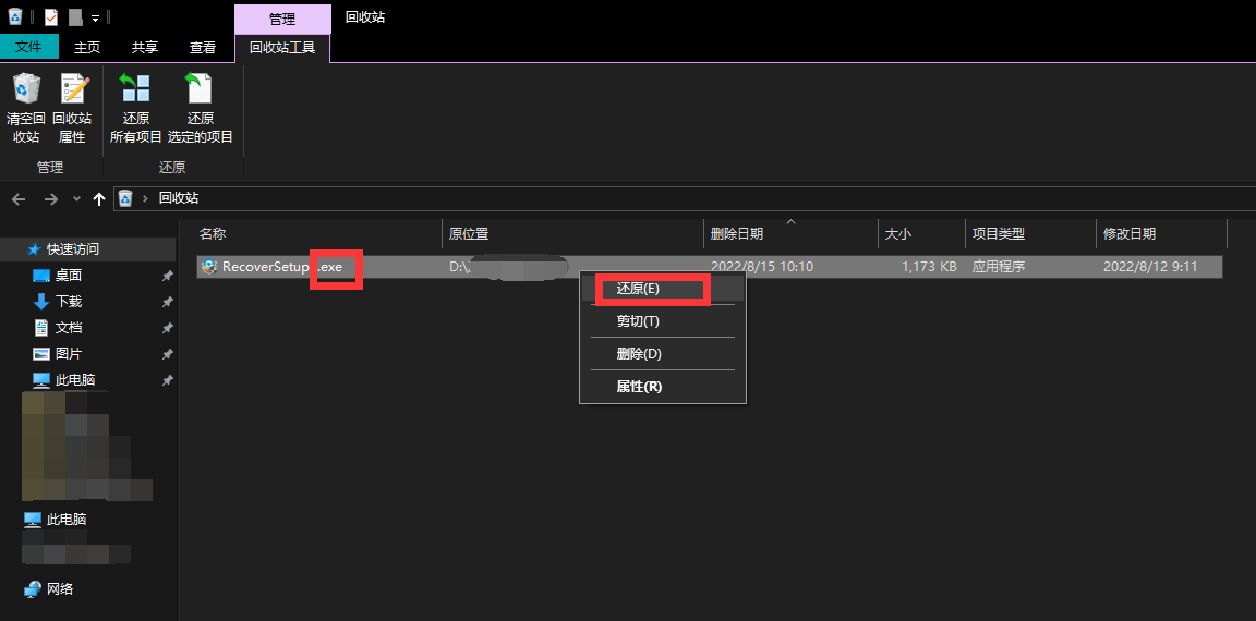 如果我们在卸载了软件之后,还未对回收站进行清理,这个方法百分百有效。在回收站里找到exe后缀的文件,点击还原即可。