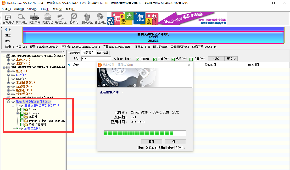 打开DiskGenius之后,在左边有电脑里所有硬盘信、U盘信息,小编这里是恢复U盘里被删除或者被卸载的软件,所以选择U盘进行操作。