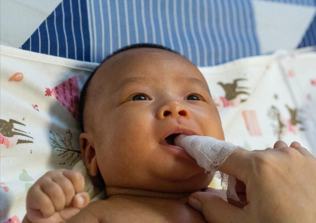 ① 用冰镇过的干净纱布,经常帮宝宝擦拭牙龈;