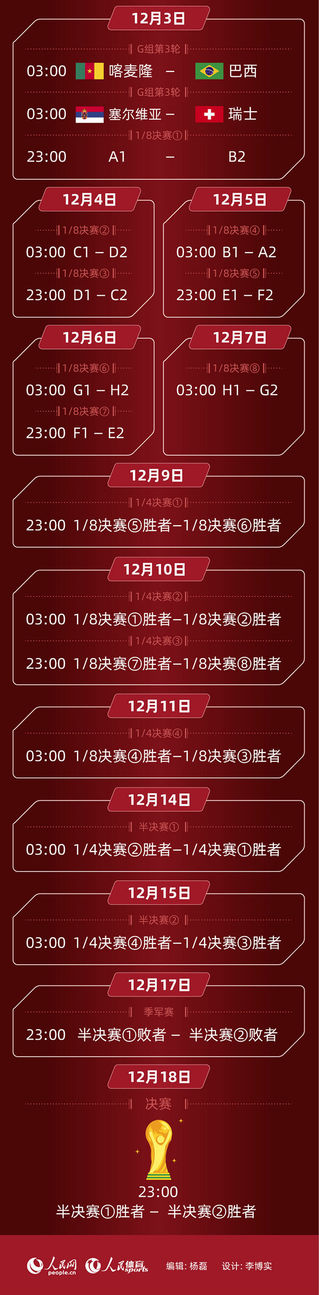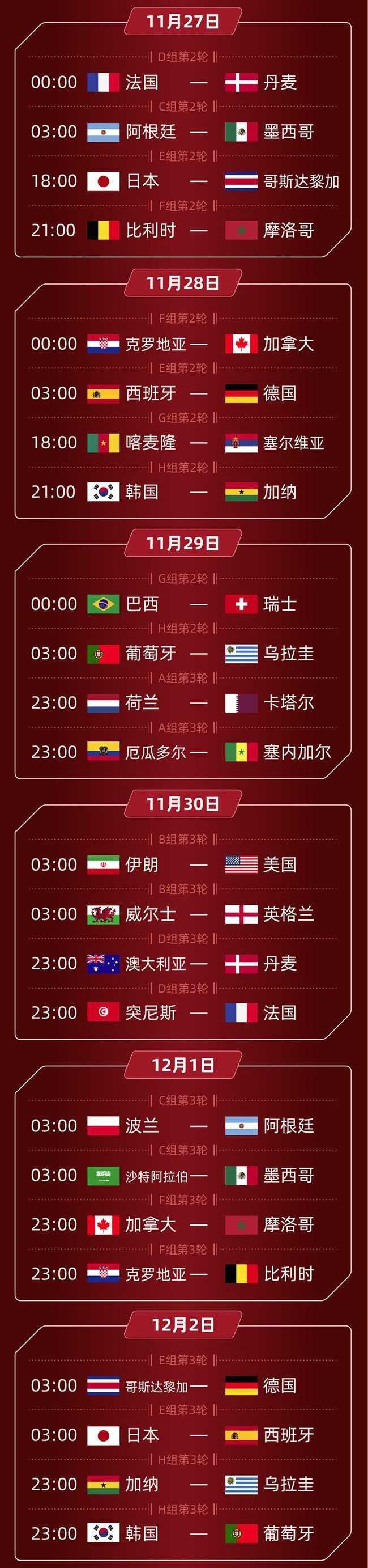 人民网北京11月15日电北京时间11月21日00:00,2022年卡塔尔世界杯揭幕战将正式打响,东道主卡塔尔队将对阵厄瓜多尔队。淘汰赛将于12月3日23:00开始,决赛将在12月18日23:00进行。32支球队,64场比赛,目标只有一个——大力神奖杯。四年一届的世界杯近在眼前,哪些比赛不容错过?