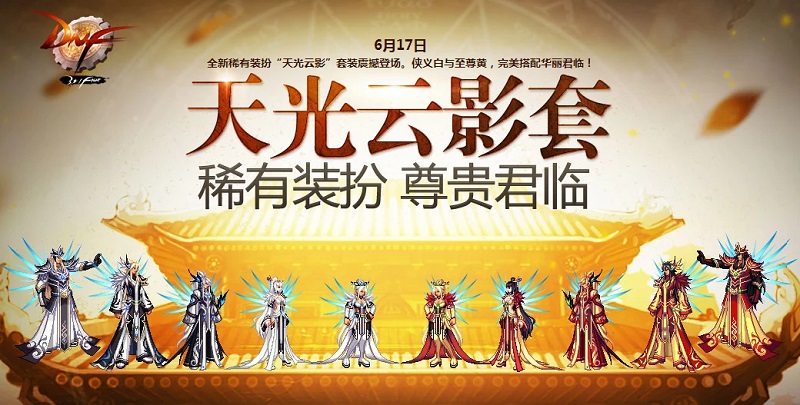 国服的第一套稀有装扮,天空套的名称也是此时开始兴起的,由来就是这一套的名字。这一套中玩家们比较喜欢的就是鬼剑士的深渊骑士套和男枪手的鸟人套了,其外观虽不出彩但是却是老玩家身份的一种象征,尤其是深渊骑士套更有大主播旭旭宝宝代言,名气可见一斑。