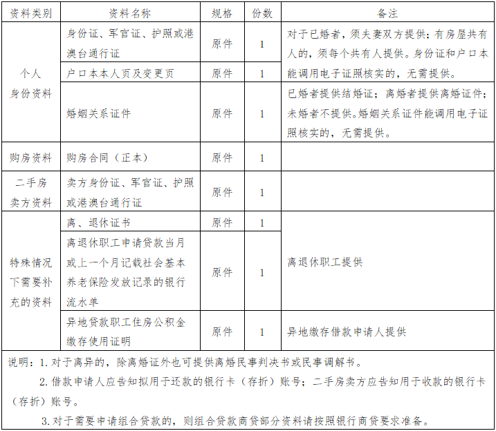 借款申请人需准备以下申请资料,包括:个人身份资料、购房资料、特殊情况下需要补充的资料。