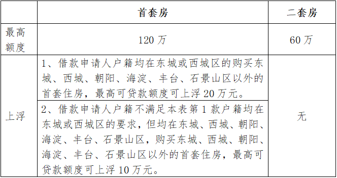 借款申请人购买第一套住房政策规定最高可贷120万,根据户籍所在区域外迁购房,还可上浮10-20万。购买二套住房政策规定最高可贷60万,具体规定如下表。同时,借款申请人最高可贷款额度要根据其具体情况计算得出。