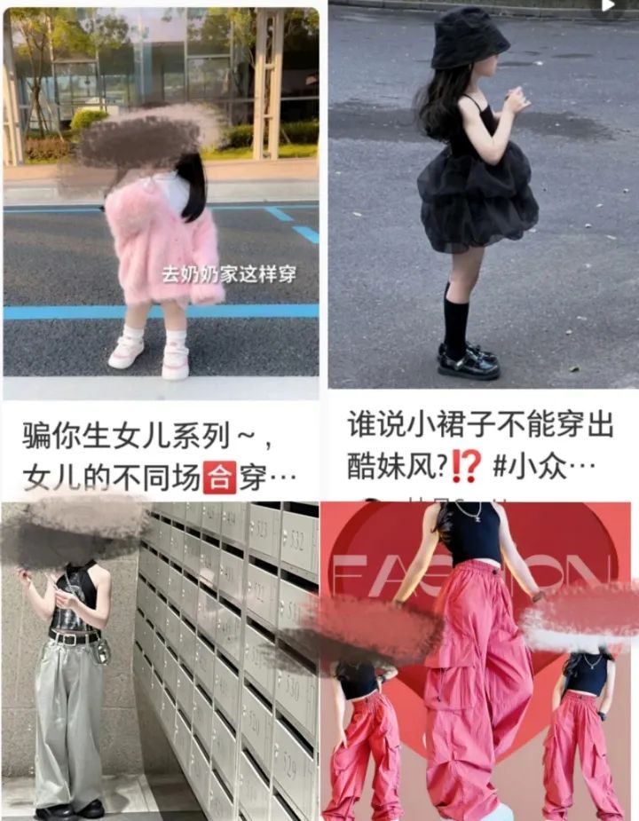 社交平台上一搜,黑丝袜、露背装、露肩皮草,很多家长分享自己给孩子设计的“辣妹穿搭”,有的还会打上“奶辣”“抹胸”“豹纹”等标签。有人不理解,这些性感的穿搭,竟然穿在幼儿园小孩身上?