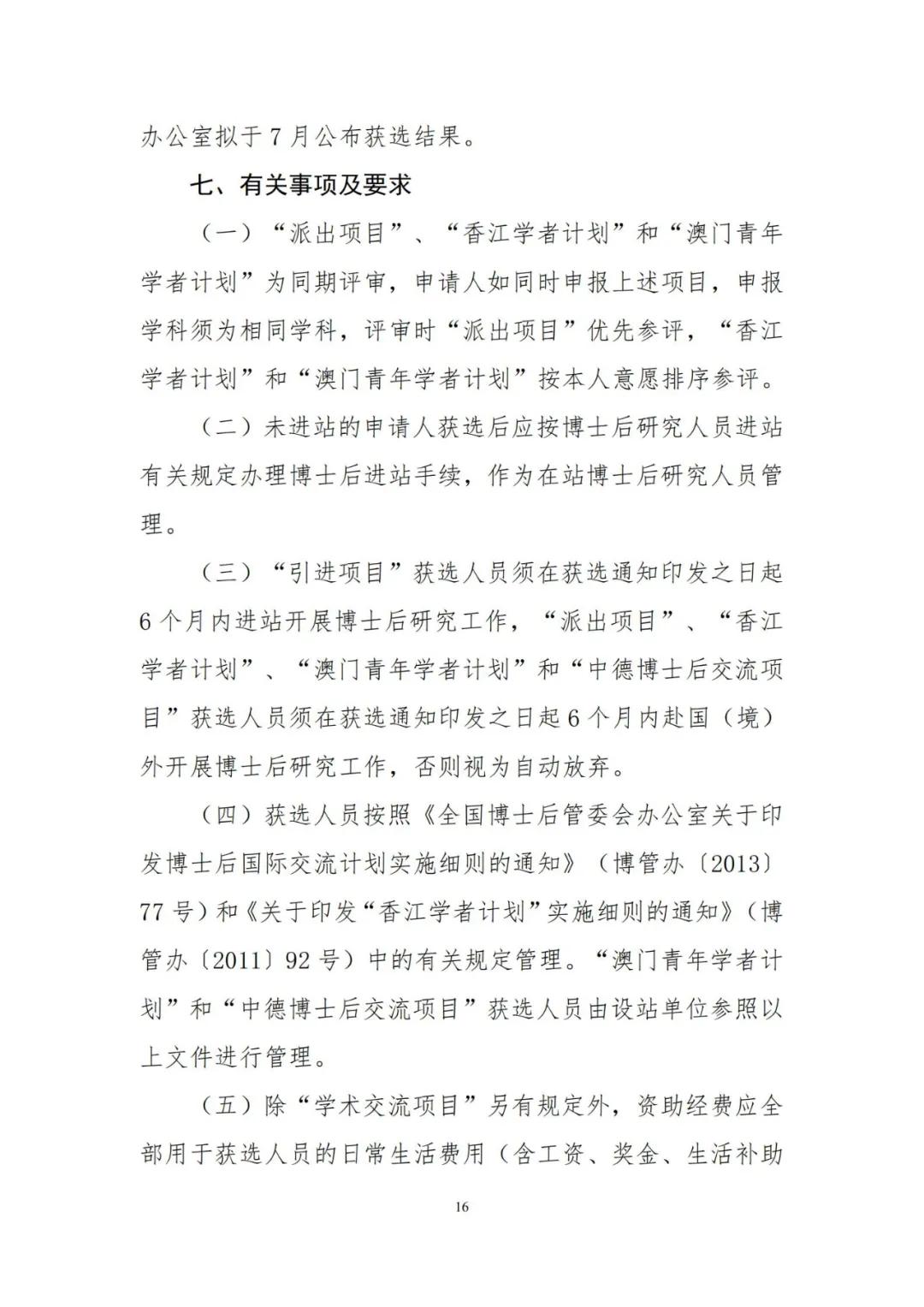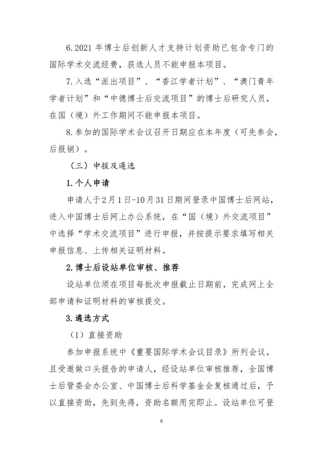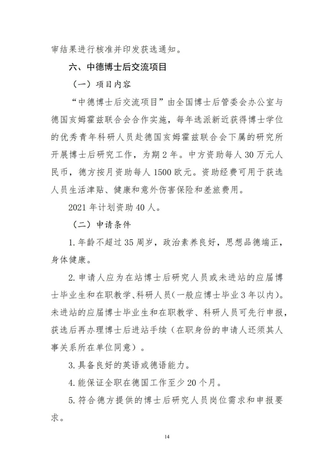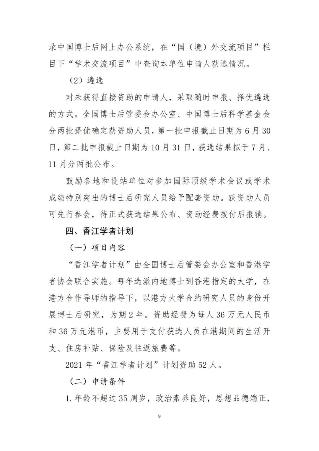 为加强博士后创新能力建设,进一步提升博士后国际化水平,人力资源和社会保障部、全国博士后管理委员会决定2021年继续实施博士后国(境)外交流项目,并编制了《2021年博士后国(境)外交流项目申报指南》(见附件),内容包括博士后国(境)外交流项目所属“博士后国际交流计划引进项目、派出项目、学术交流项目”,以及“香江学者计划”、“澳门青年学者计划”和“中德博士后交流项目”共6个项目的主要内容、申报条件、遴选程序、有关要求等。