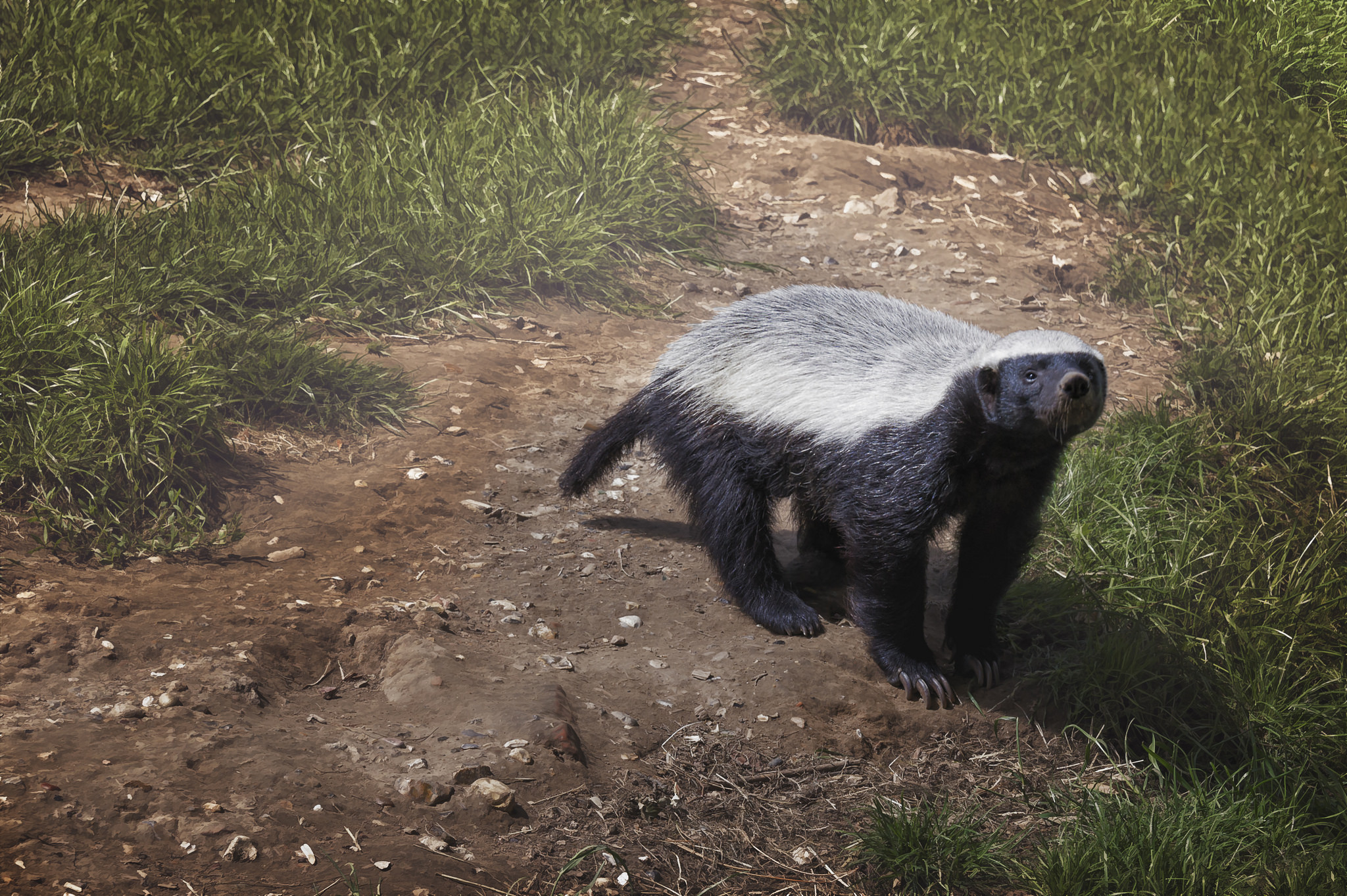 蜜獾成名的视频大概有这么几个:上树抓蛇、被毒蛇咬一口昏迷一小会继续生龙活虎吃蛇、啃狮子的脚丫子、组团从水泥池子里各种越狱等,相信了解蜜獾的朋友都看过这几个视频,没见过的可以去搜搜看。然后,就有几个好兄弟根据这些视频和网上的图给蜜獾写了好多拍马屁的文章(还有各种顺口溜儿),导致现在大部分人的印象里,蜜獾都是战斗力爆炸的平头哥,号称非洲陈浩南,上天入地无所不能,还敢攻击狮子和豹,谁也不是它的对手。