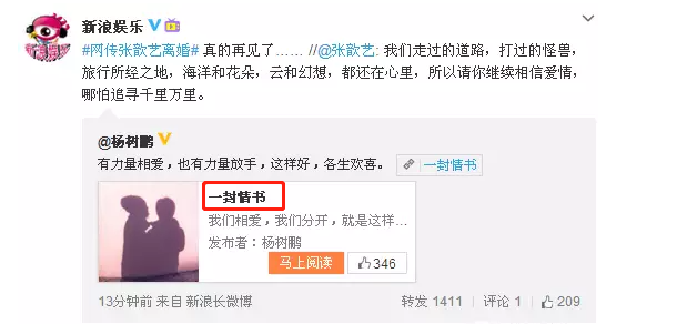 而且杨树鹏的离婚宣言还是“一封情书”,堪称“离婚文案范本”。