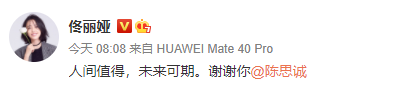 佟丽娅也同时发文:“人间值得,未来可期。谢谢你。”