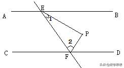 【分析】由PE与PF分别为角平分线,得到两对角相等,根据∠1与∠2的度数,求出∠BEF与∠EFD的度数之和为180度,利用同旁内角互补两直线平行即可说明。