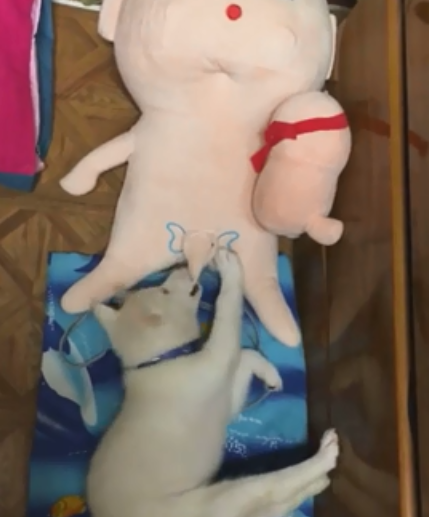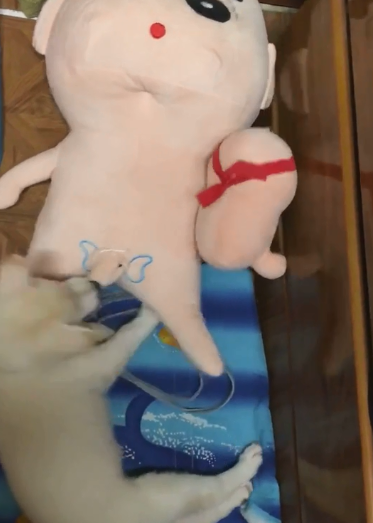 但这次它使出了吃奶的力气啃咬。对着小新的大象又咬又咀嚼,还一只爪子搭在上面咬着左右拉扯,感觉是想把它咬下来,玩得不亦乐乎,完全不管主人在一旁拍摄。可怜的小新被咬着大象拖着动,小新痛但是小新说不出。最后Maggie也是咬着咬着,突然就断片睡着了。这个小新和小白不能不说的秘密,被主人就这么发到网上。