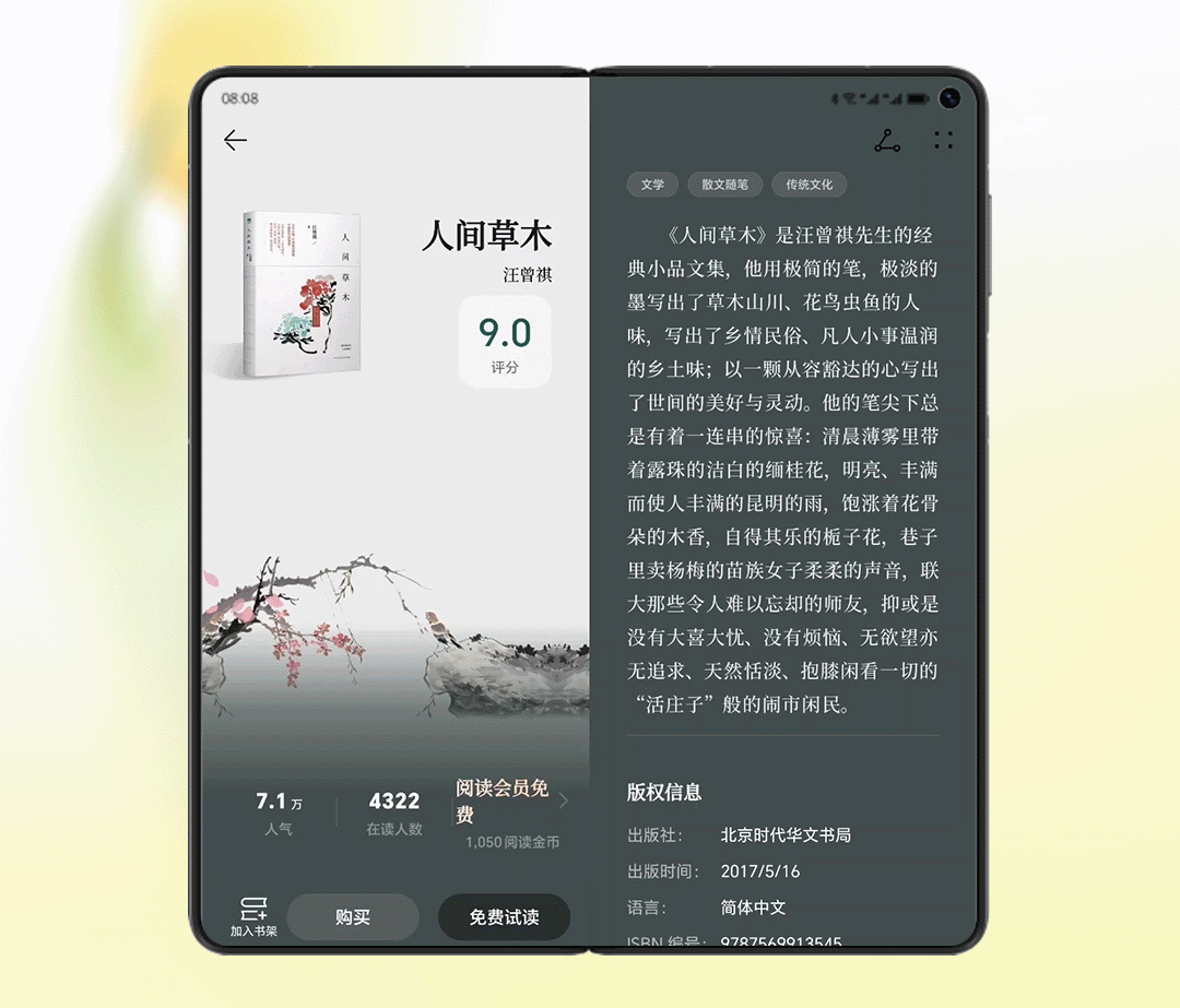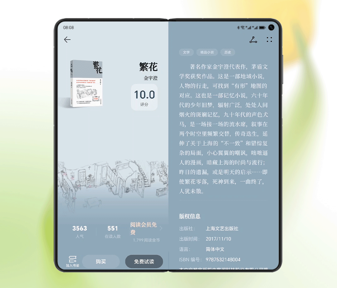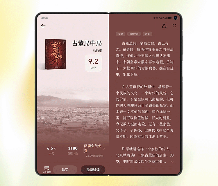 无论在主流的直板手机,还是折叠屏机型,都会有着完美还原纸质精装书的阅读体验。赏心悦目,一目了然,让用户对于信息的感知更加及时、流畅、舒适。