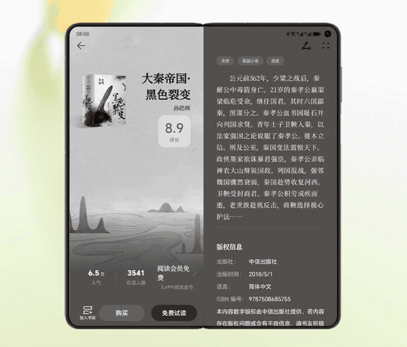 现在,全新的华为阅读将赋能最新发布的华为 Mate X3 折叠屏手机,让阅读体验不但还原了纸质书,还要做到超越纸质书。