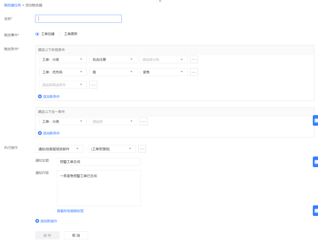 工单触发器功能非常灵活、强大,可预先设定触发事件和一系列条件,当这些事件和条件满足时,会触发工单触发器,执行预设的动作。工单触发器可用来执行企业业务流程、处理特殊事件、建立自动化流程等。