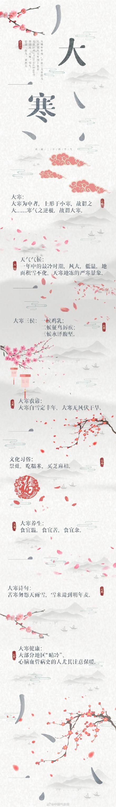 大寒,是全年二十四节气中的最后一个节气。大寒同小寒一样,也是表示天气寒冷程度的节气,大寒是天气寒冷到极致的意思。 大寒,从字面上看就是一年里最冷的一天了。实际上从统计数据来看,多数时候小寒才是一年里面气温最低的时候。 平均气温:从1951-2016年“大寒”和“小寒”节气期间我国平均气温来看,小寒节气我国平均气温为-5.6℃,大寒节气气温平均值为-4.9℃。 时间分布:在1951-2016年这66年中,小寒更冷的年份占到27年,大寒更冷的年份占19年。 空间分布:在黄河以北的大部地区,“大寒”节气期间的平均最低气温比小寒节气要低;而在长江和黄河之间的地区,“大寒”“小寒”的冷不相上下;长江以南地区,“小寒”节气则要比“大寒”节气冷。 大寒节气由于近年,所以充满了喜悦与欢乐的气氛,在这个节气期间,人们开始忙着除旧饰新,腌制腊味年肴,准备年货,因为中国人最重要的节日——春节就要到了。 大寒一过 又将开始新的节气轮回 让我们继续努力,迎接新年钟响