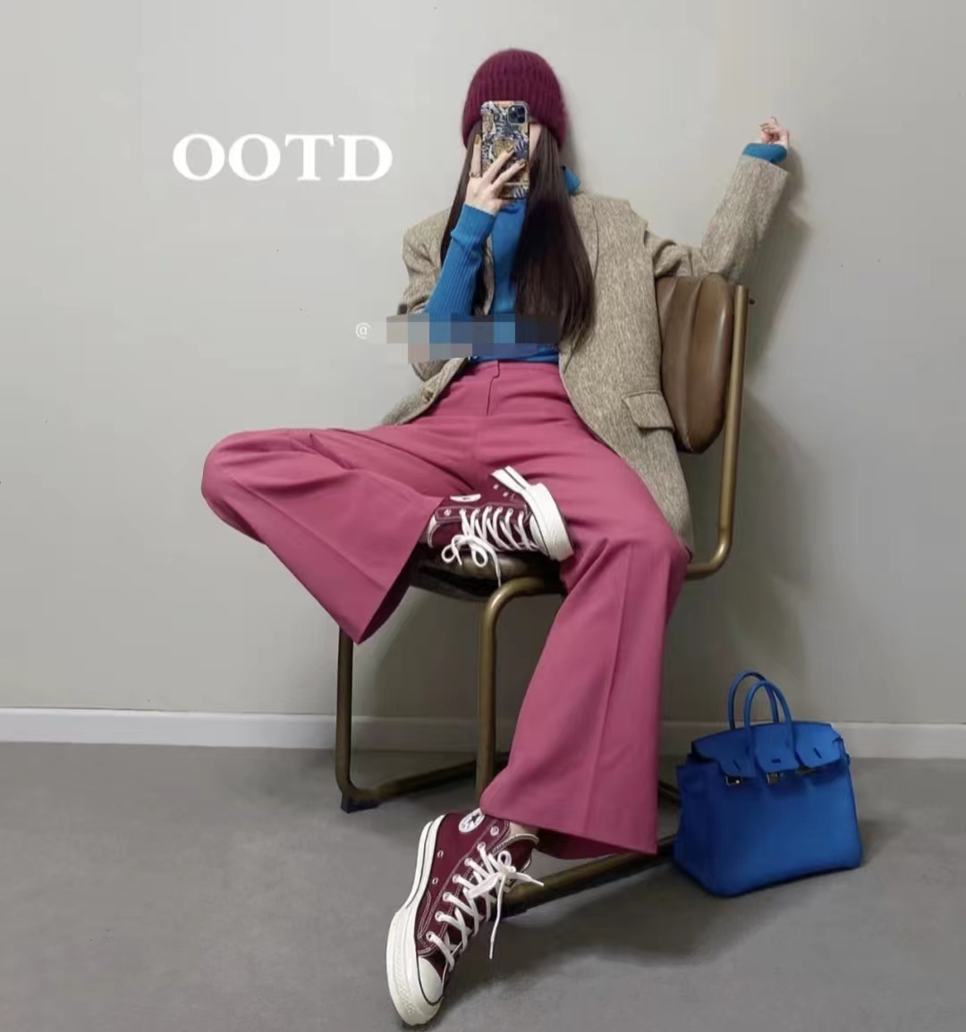高级感酒红枚粉蓝撞色INS风,你尝试过的美丽配色吗?玫粉色跟蓝色撞色高级又很有活力,再搭配酒红色的帽子跟鞋子,丰富又和谐,杏色西装中和跳跃的色彩,互相衬托时髦感?