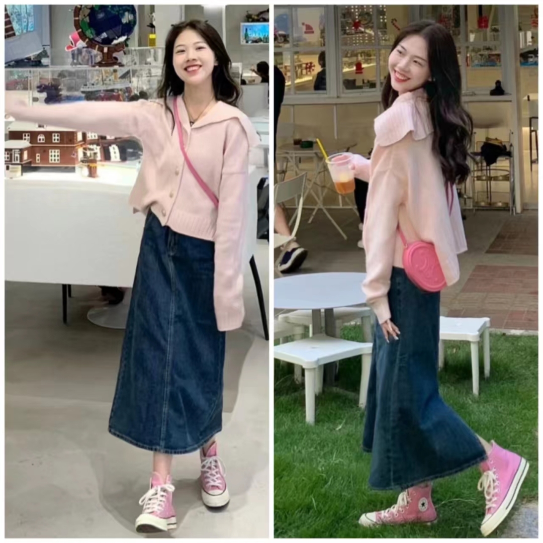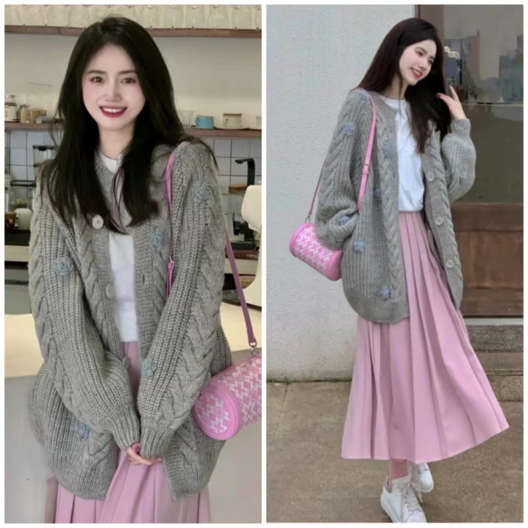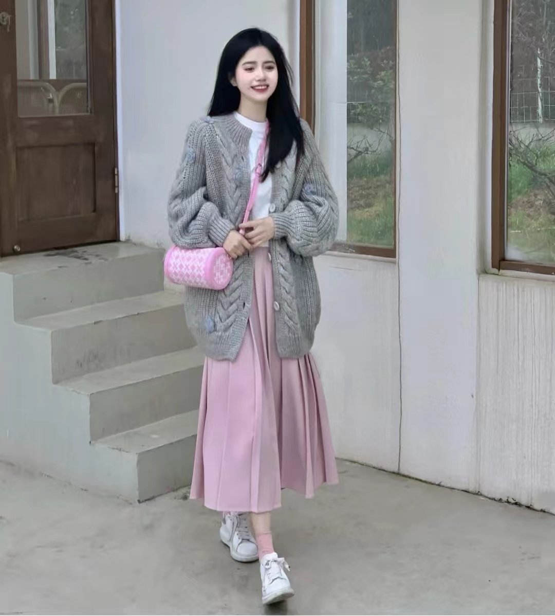 哪个女孩子能抗拒粉色呢,灰色大毛衣外套搭配烟熏粉百褶裙,裙子的色系太正了!灰粉配yyds,再搭配一个粉色系的包包完美适配,简单又干净,韩系氛围感满满~