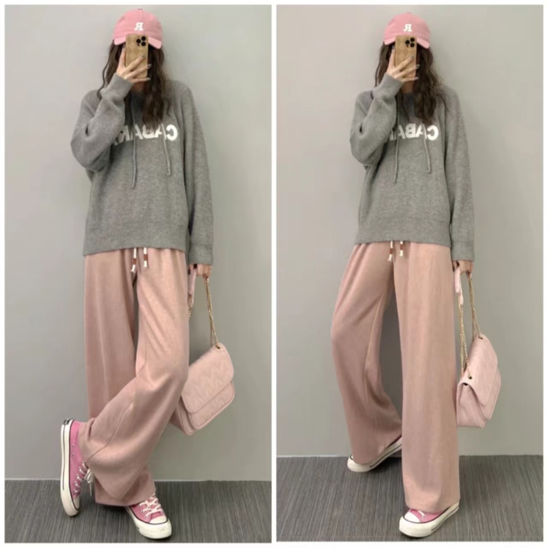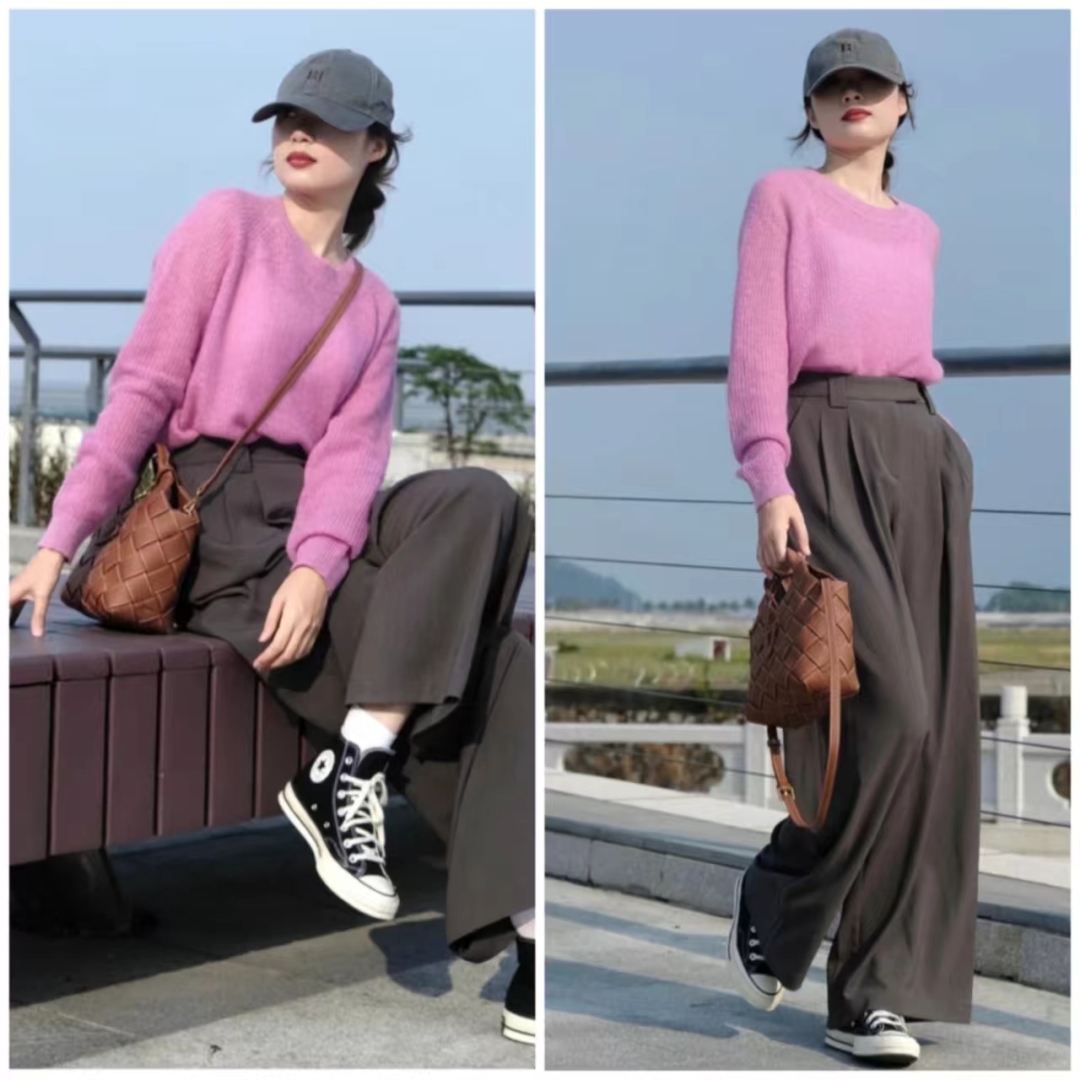 灰色的宽松休闲针织卫衣搭配粉色休闲长裤+休闲板, 简约舒适又干净,虽然整身搭配只有两个颜色,但一点儿也不会觉得无聊,有种云淡风轻的高级感,是秋冬里的一抹温馨色彩?