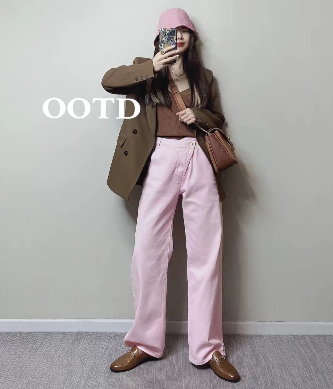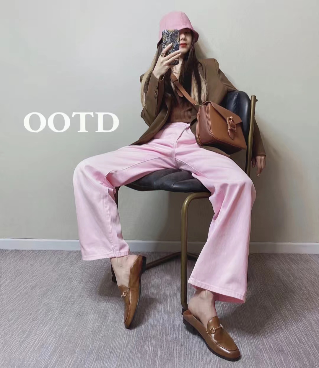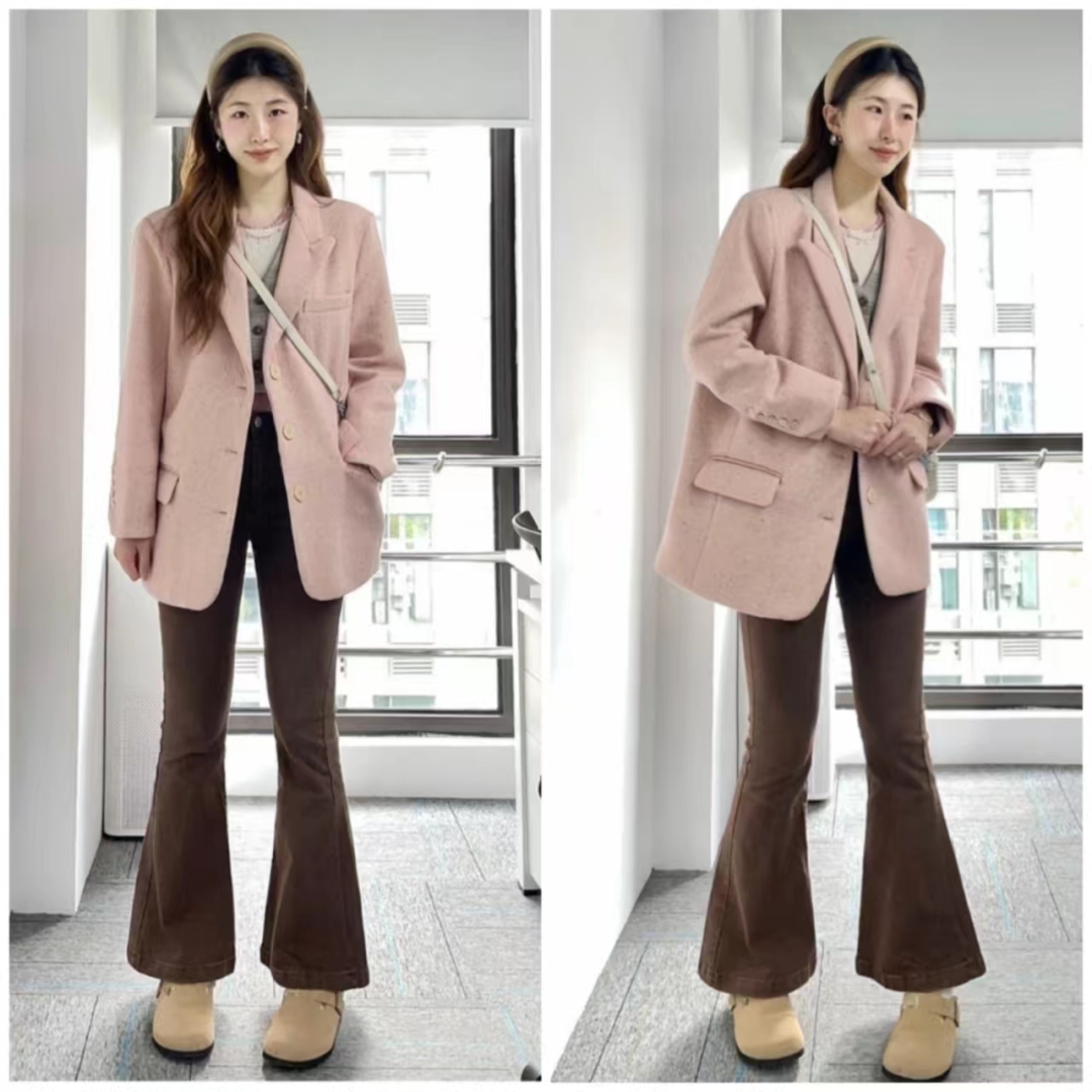 看到这件粉西装第一眼就决定拿下它,毛呢面料厚款西装,内搭高领打底衫就很保了,下半身搭配棕色微喇裤,微喇版型修饰小腿超级棒,一套粉棕撞色没踩雷?