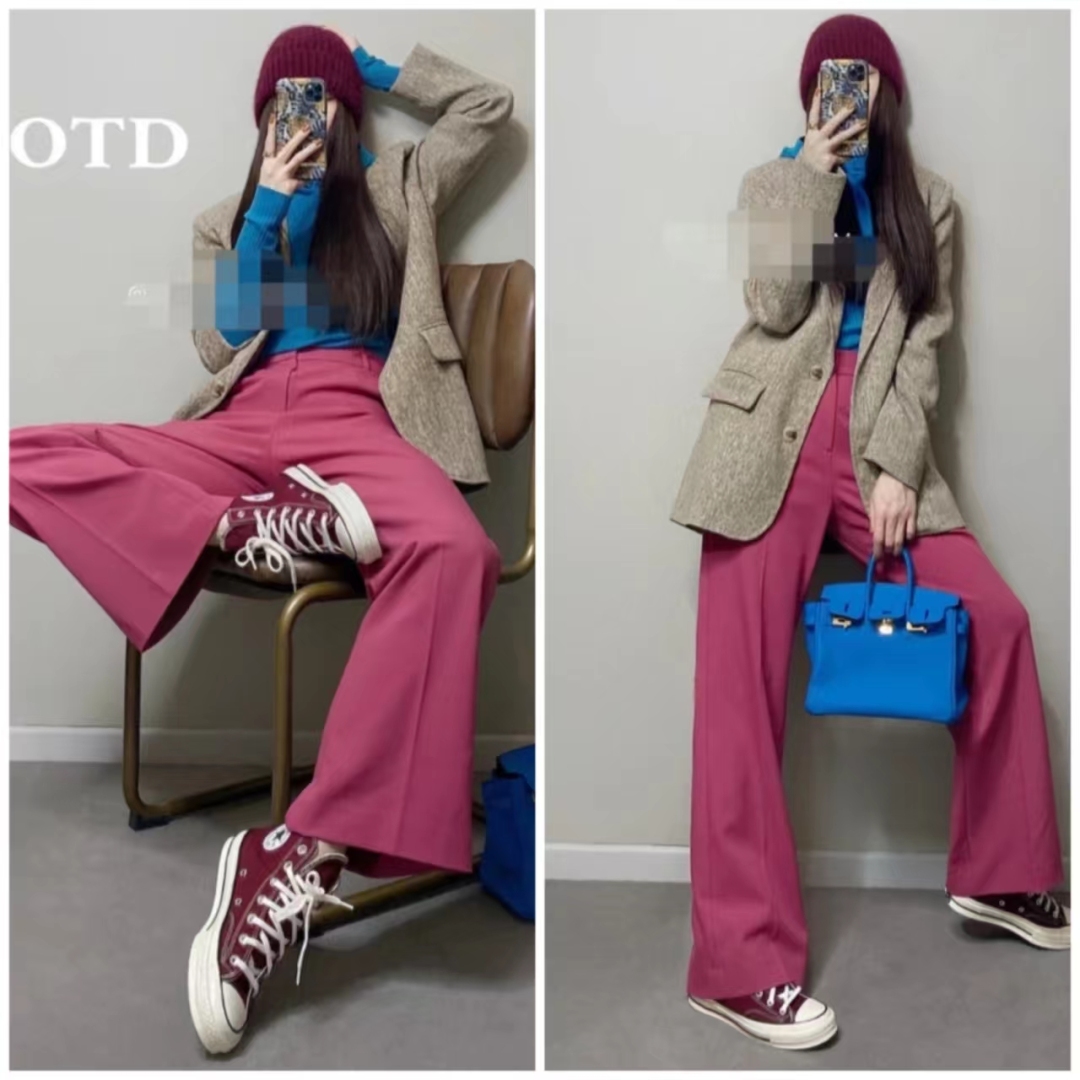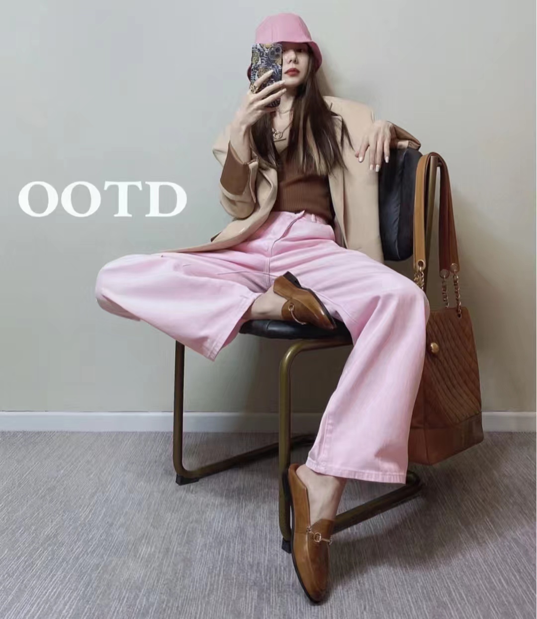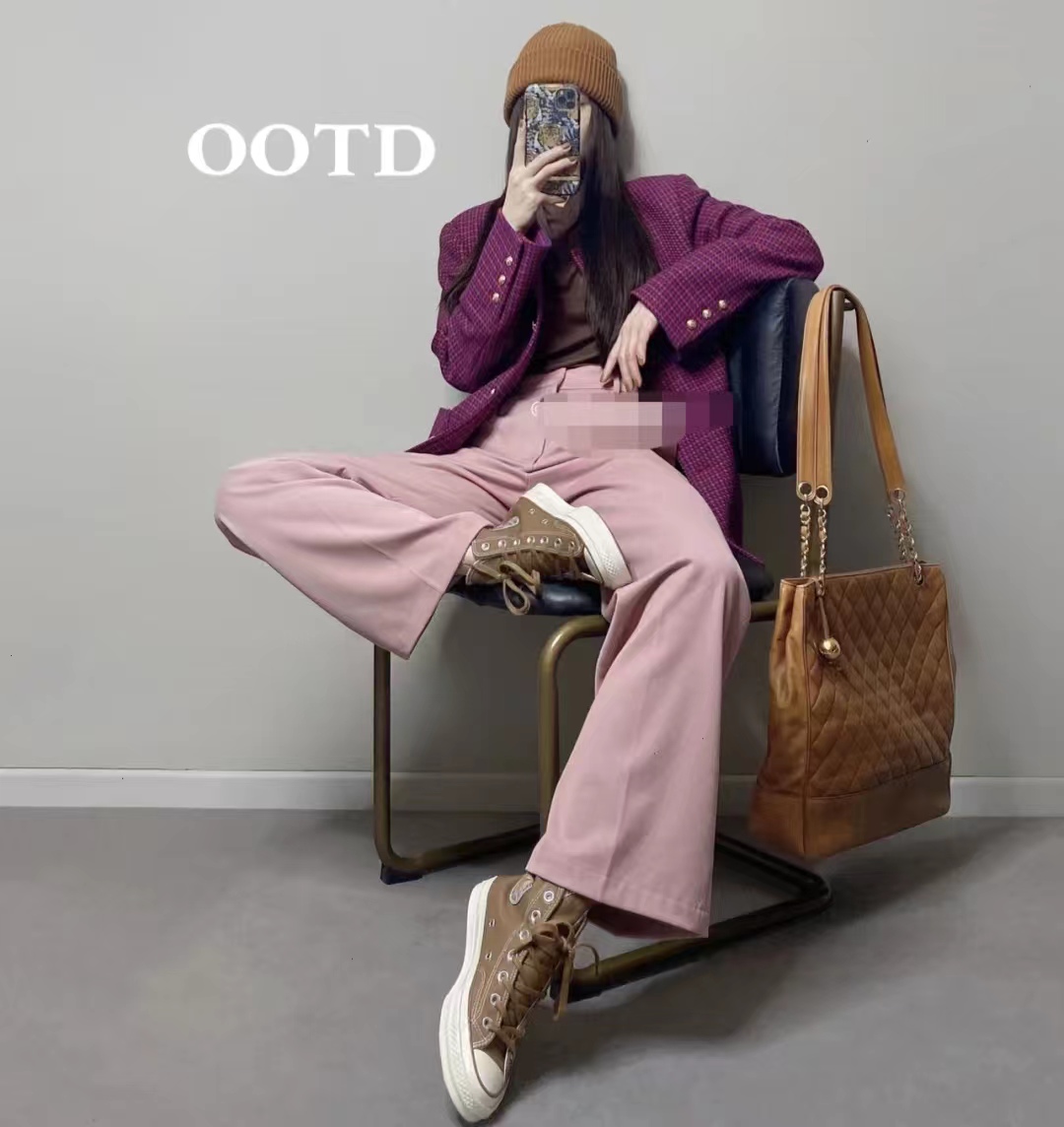 看到这件粉西装第一眼就决定拿下它,毛呢面料厚款西装,内搭高领打底衫就很保了,下半身搭配棕色微喇裤,微喇版型修饰小腿超级棒,一套粉棕撞色没踩雷?
