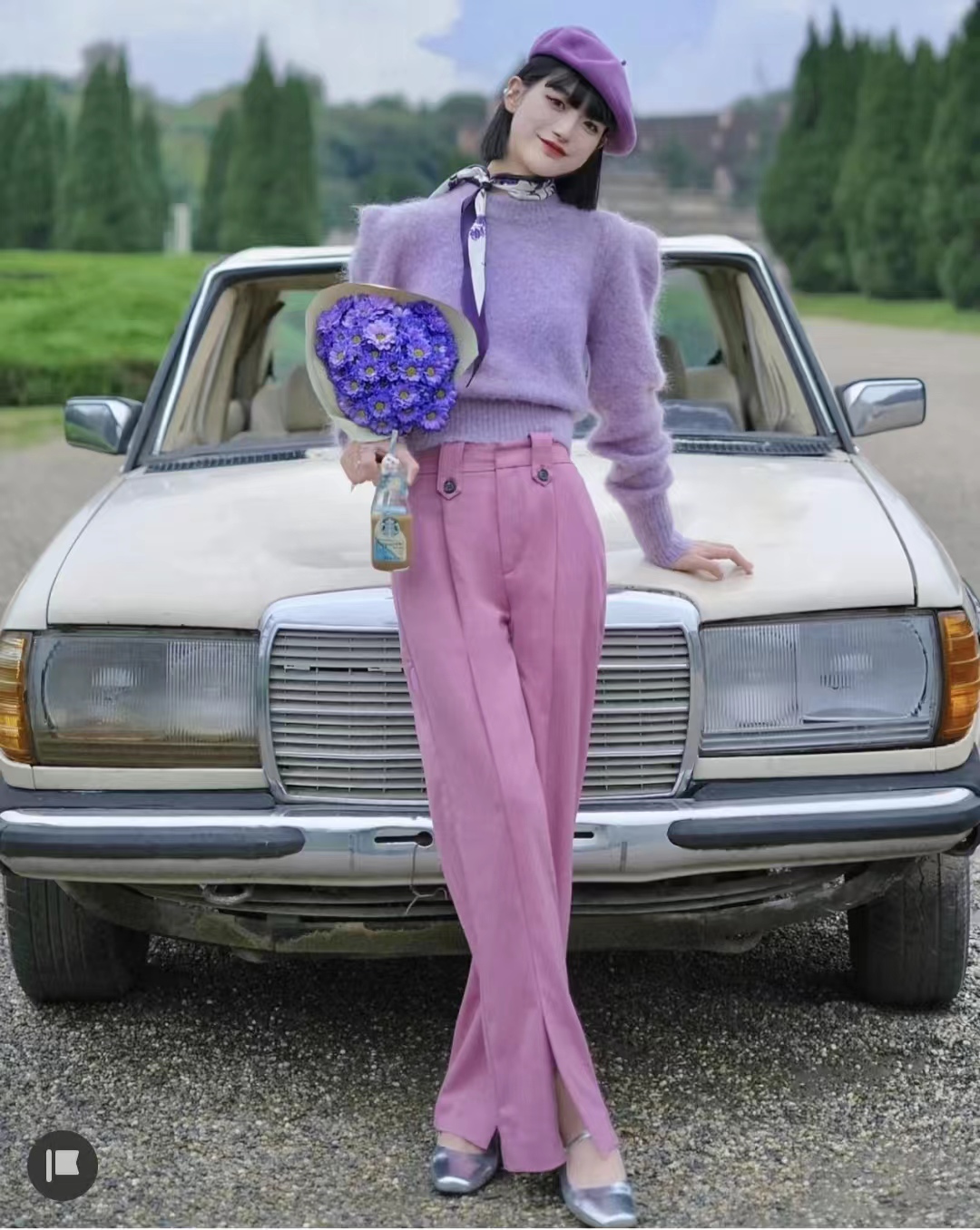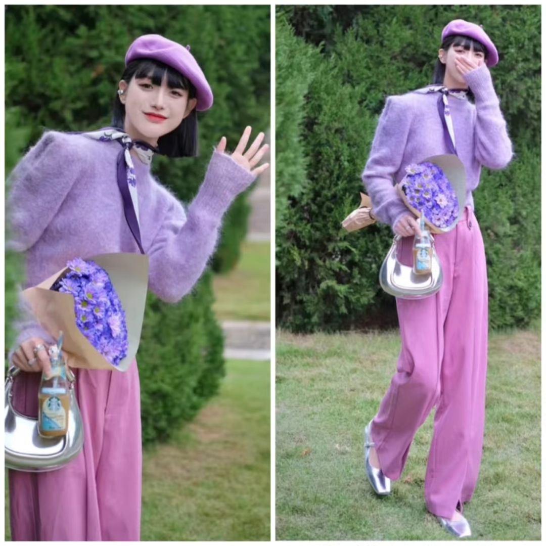 紫色真是自带浪漫氛围,软糯的紫毛衣配粉色西裤温柔又随性,紫色丝巾增加精致感,舒适的一套出游。平凡的日子要多姿多彩地生活下去?