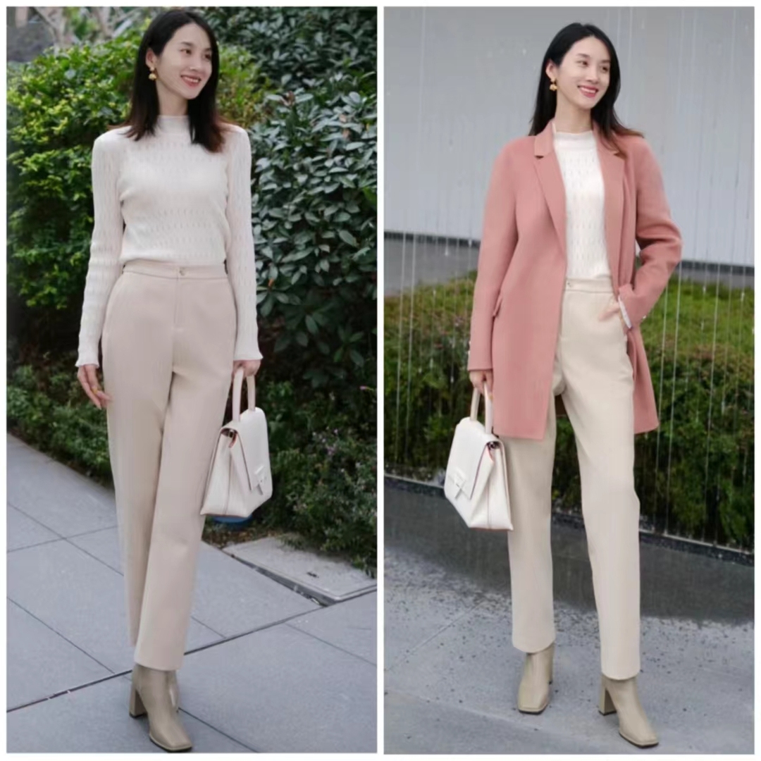 look3 玫粉色裤子+蓝色针织/杏色西装