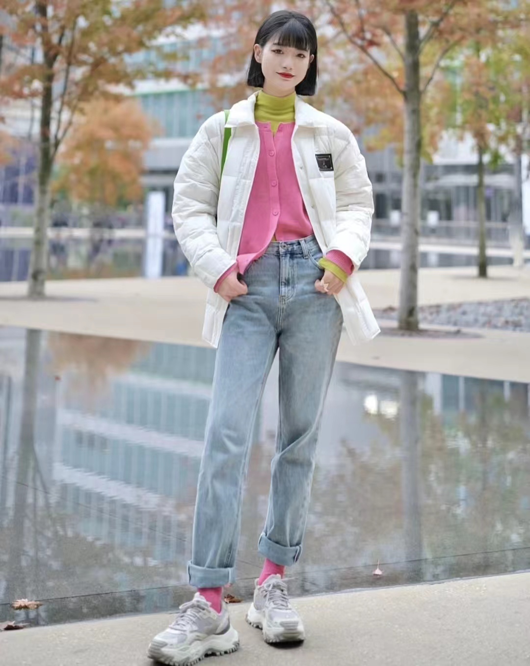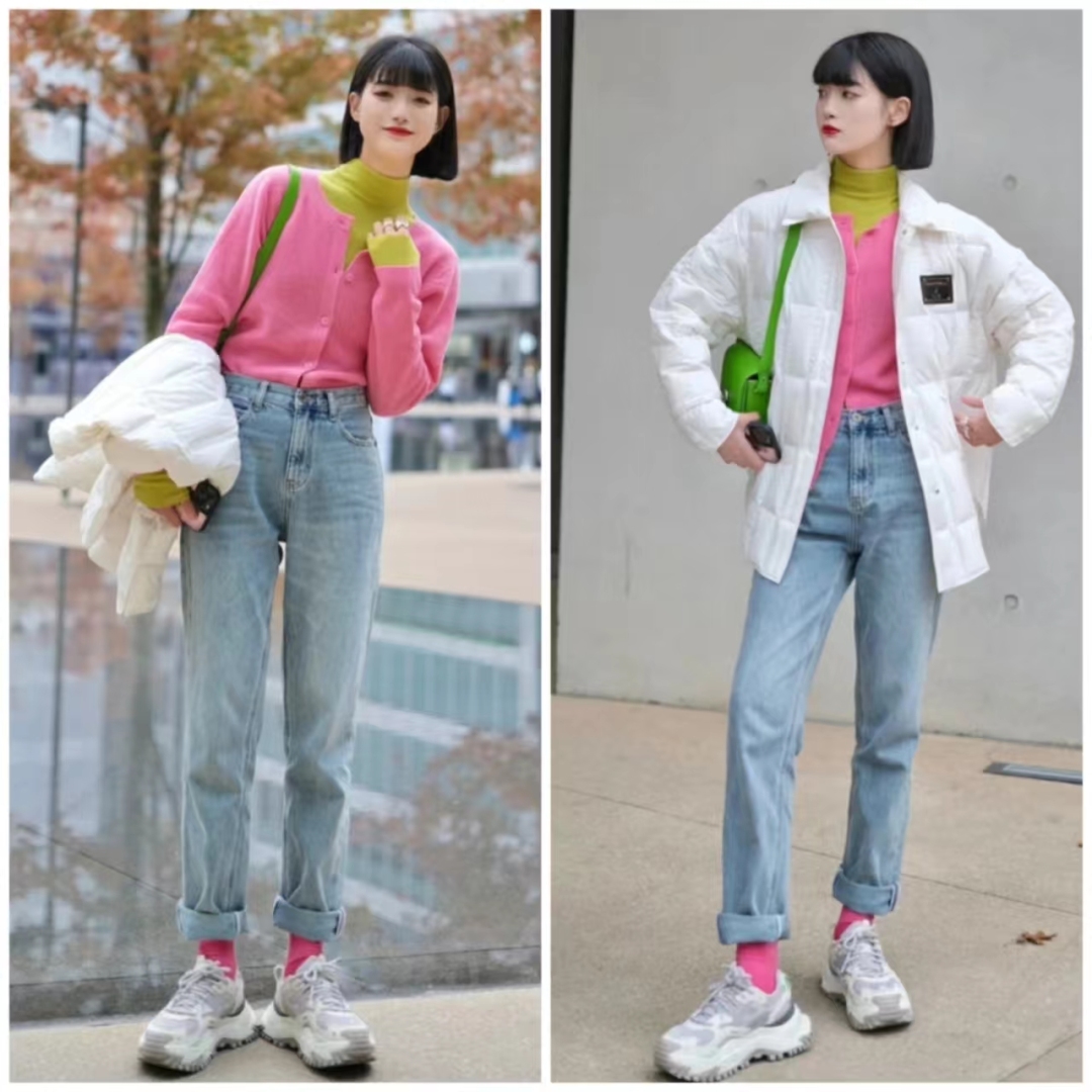 秋冬氛围越来越浓郁,轻薄款羽绒服很适合现在的天气,宽松衬衫式版型随性也不会臃肿,内搭粉色开衫跟小直筒牛仔裤,小面积的绿色点缀日常又不失活力,又是保暖实穿的一套。