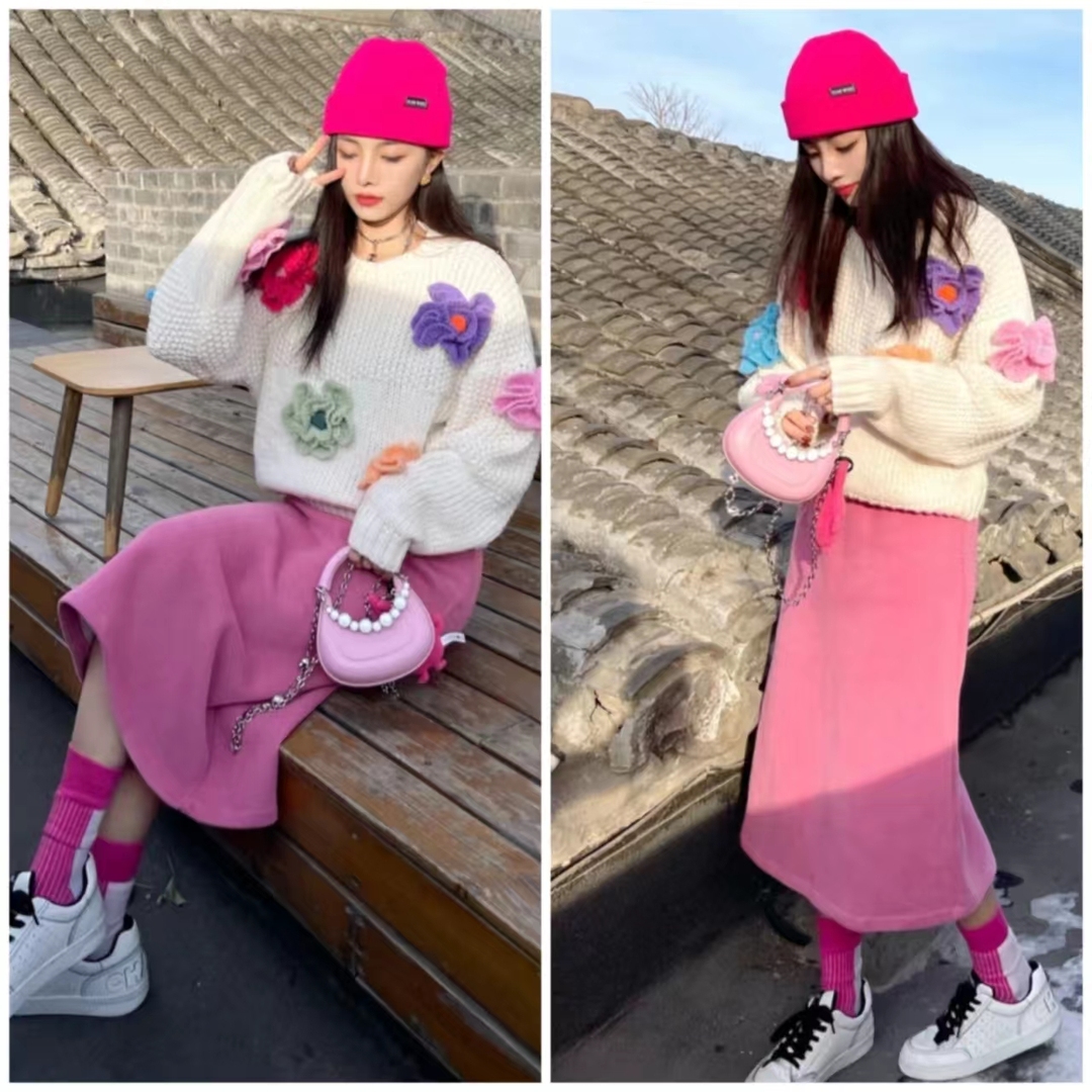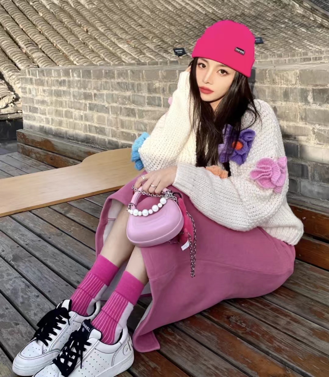 过目不忘的粉色系ins风穿搭:女孩子真的无法拒绝粉色,彩色花朵毛衣有让人开心的魔力,半裙帽子包包都用粉红色来进行搭配,活力满满整体感更强,甜甜氛围感?