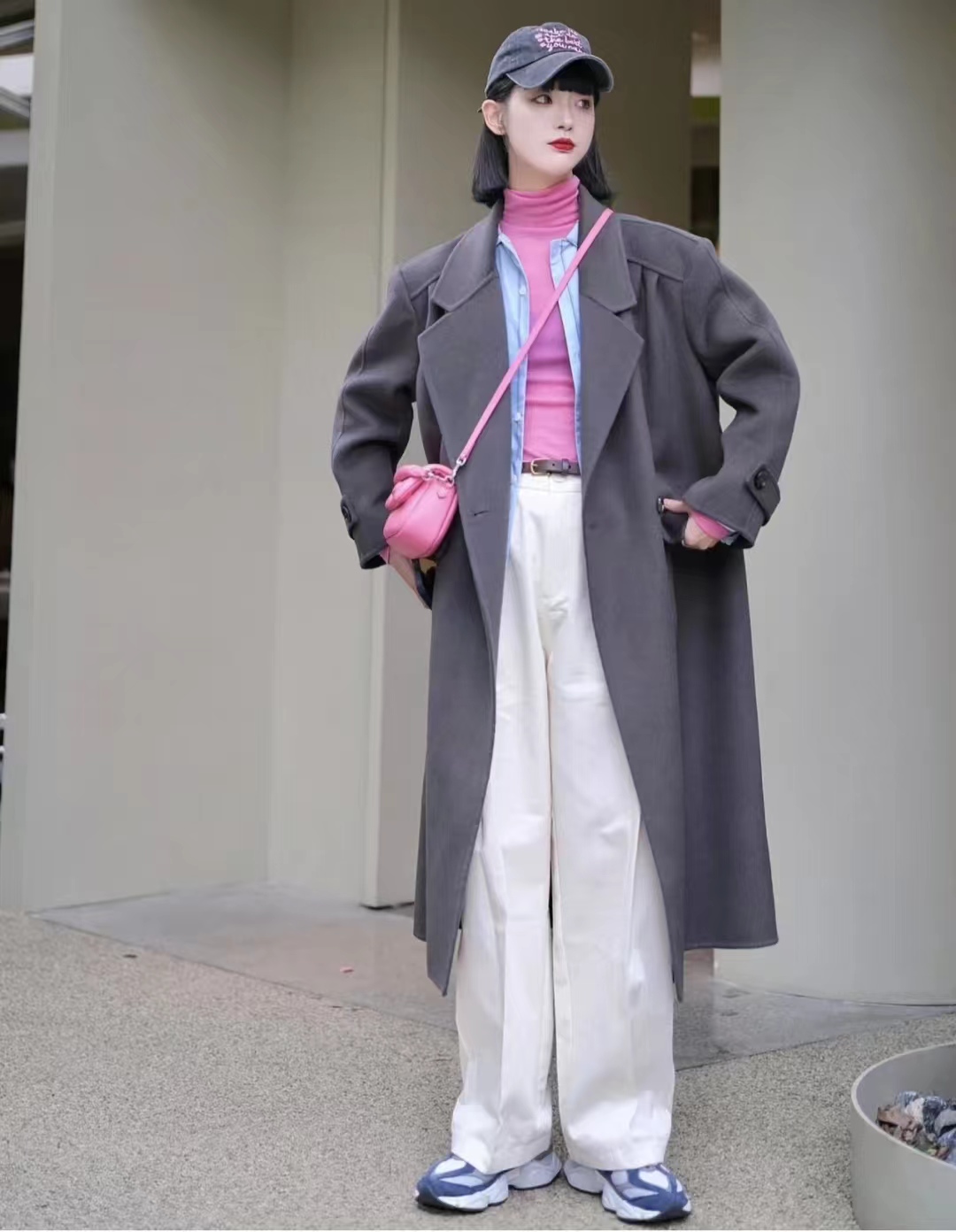 look3 粉色高领打底+蓝色衬衫/灰色大衣/白色长裤