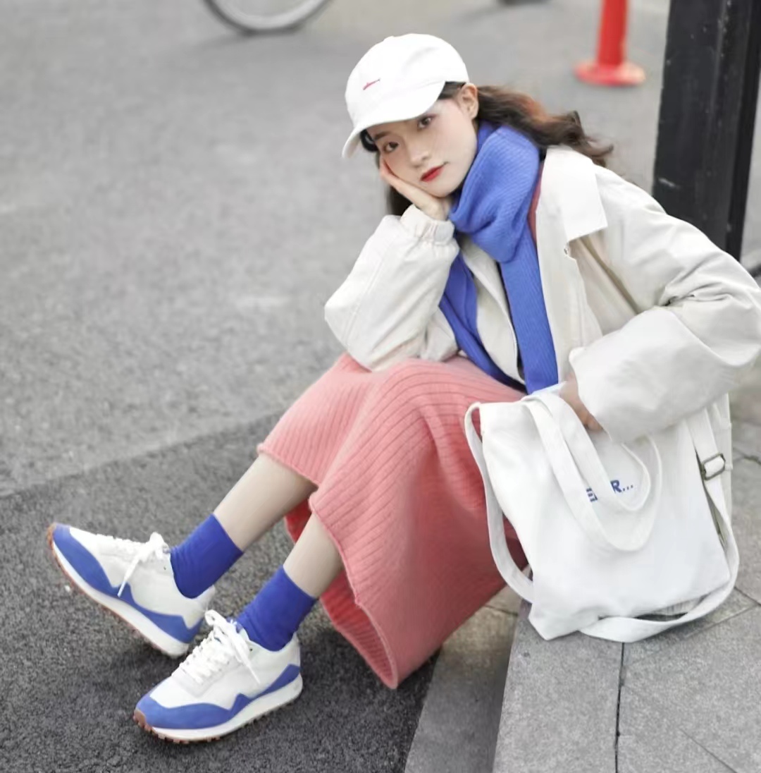 超韩系的粉蓝白配色,超元气甜美,又很随性休闲。粉色毛衣裙颜色好好看,冬天这样穿刚刚好;搭配的鞋和袜子也正好和围巾的颜色呼应上?
