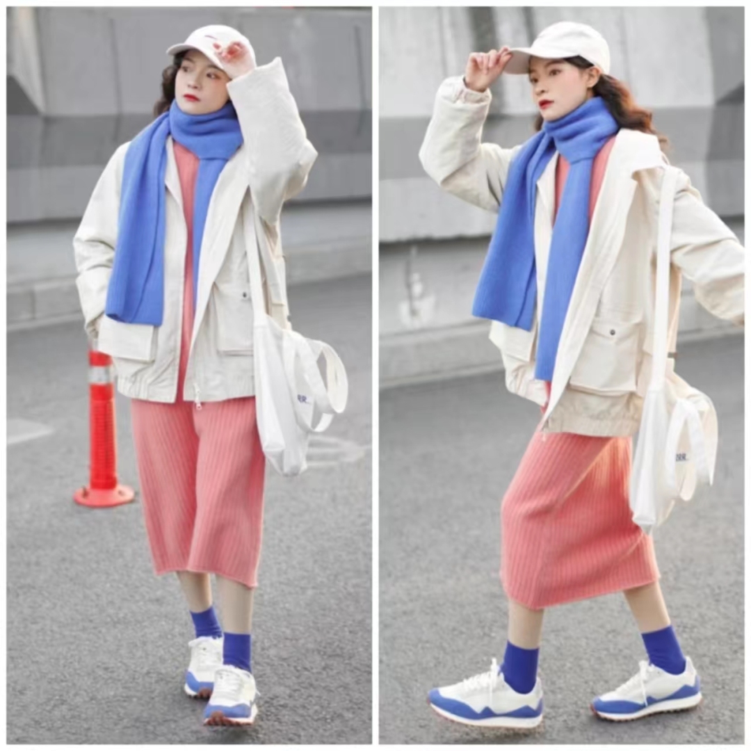 look1 粉色针织毛衣裙+白色外套/蓝色围巾