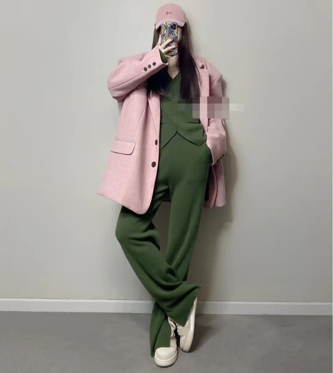 高级感粉绿撞色无性别INS:针织套装搭配一件超级阔肩的西服外套慵懒高级,帽子/西服/鞋子呼应粉色,套装和包包呼应绿色,粉粉绿绿的一套简约大气