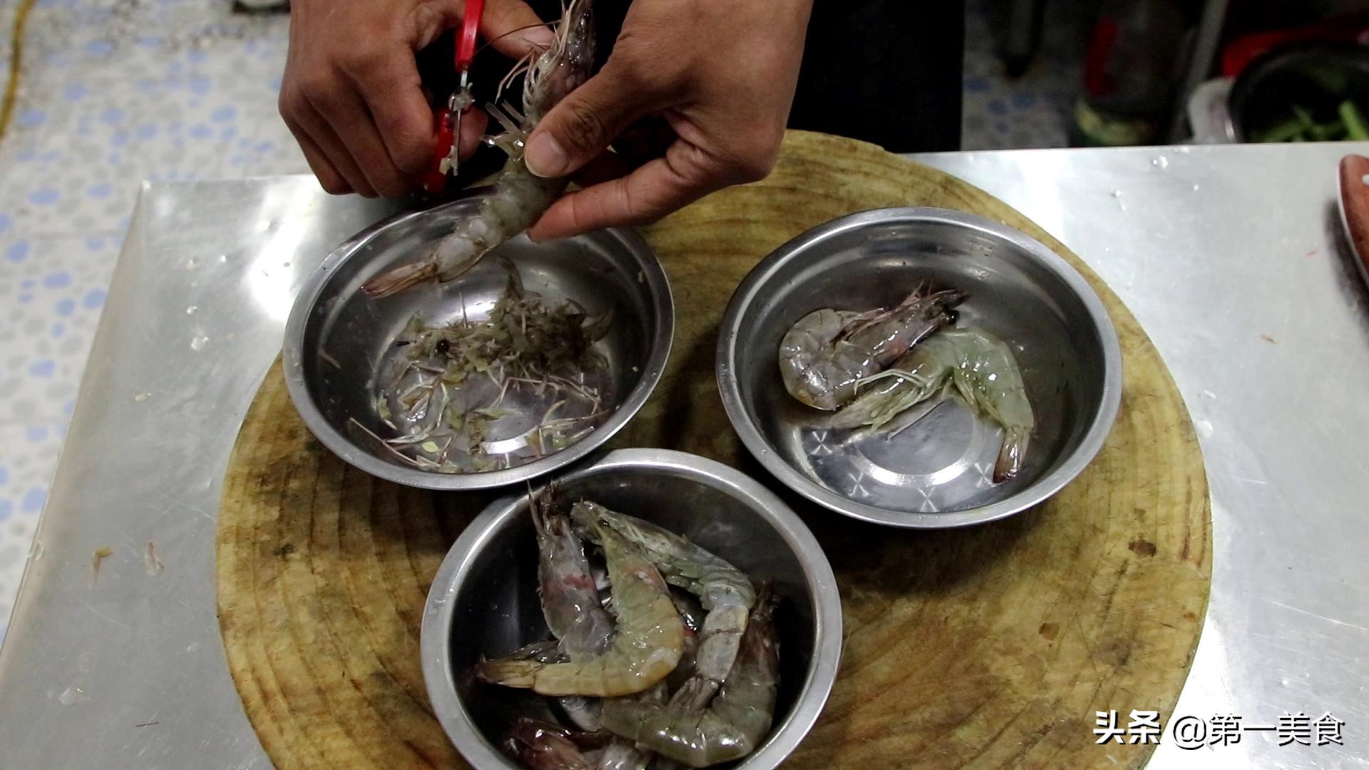 1.首先我们准备一下食材,大虾300克,用牙签挑出虾线,剪掉虾须、虾枪、虾腿、这些部位容易烧糊,影响卖相和口感,清洗干净以后备用。