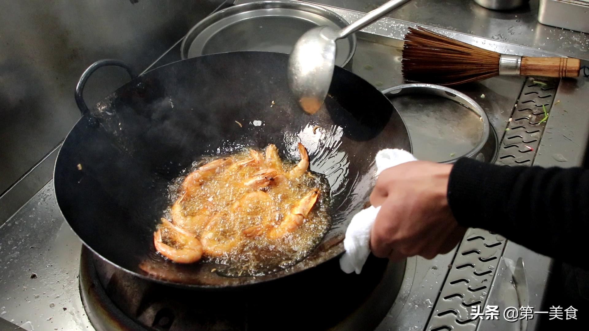5.然后我们把虾炸一下,锅内烧油,油温5成热时(轻微冒烟)放入大虾炸40秒钟,大虾表面呈金黄色时倒出控油。
