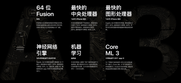 在CPU方面,A13拥有2颗高性能核心,速度提升20%、功耗降低30%;4颗效能核心,速度提升20%,功耗降低了40%;CPU还新增两个新的机器学习加速器,中央处理器每秒可进行一万亿次运算;GPU为四核心设计,速度提升20%,功耗降低40%;八核神经引擎性能提升了20%,功耗降低15%。这些性能上的提升,为双摄、Face ID、增强现实等应用提供了强有力的保障。