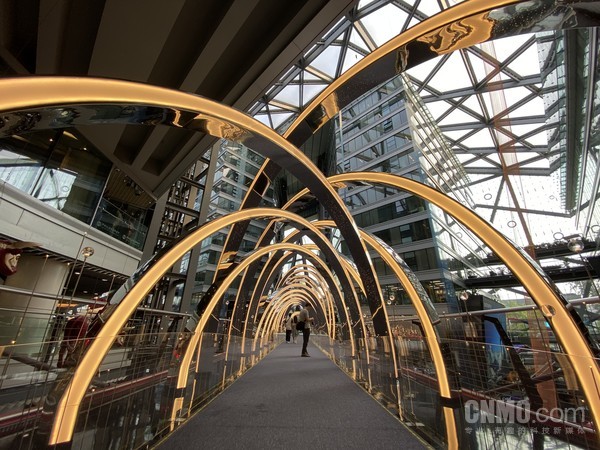 接下来让我们来到室内,拍摄场地的建筑采用的是透明屋顶,加之室内的光源,环境十分复杂。在这种情况下,iPhone 11依旧保持了很好的白平衡,画面中的灯带、远处的天花板,高光部分控制的十分优秀。而暗部的地板、栏杆扶手细节也十分清晰。