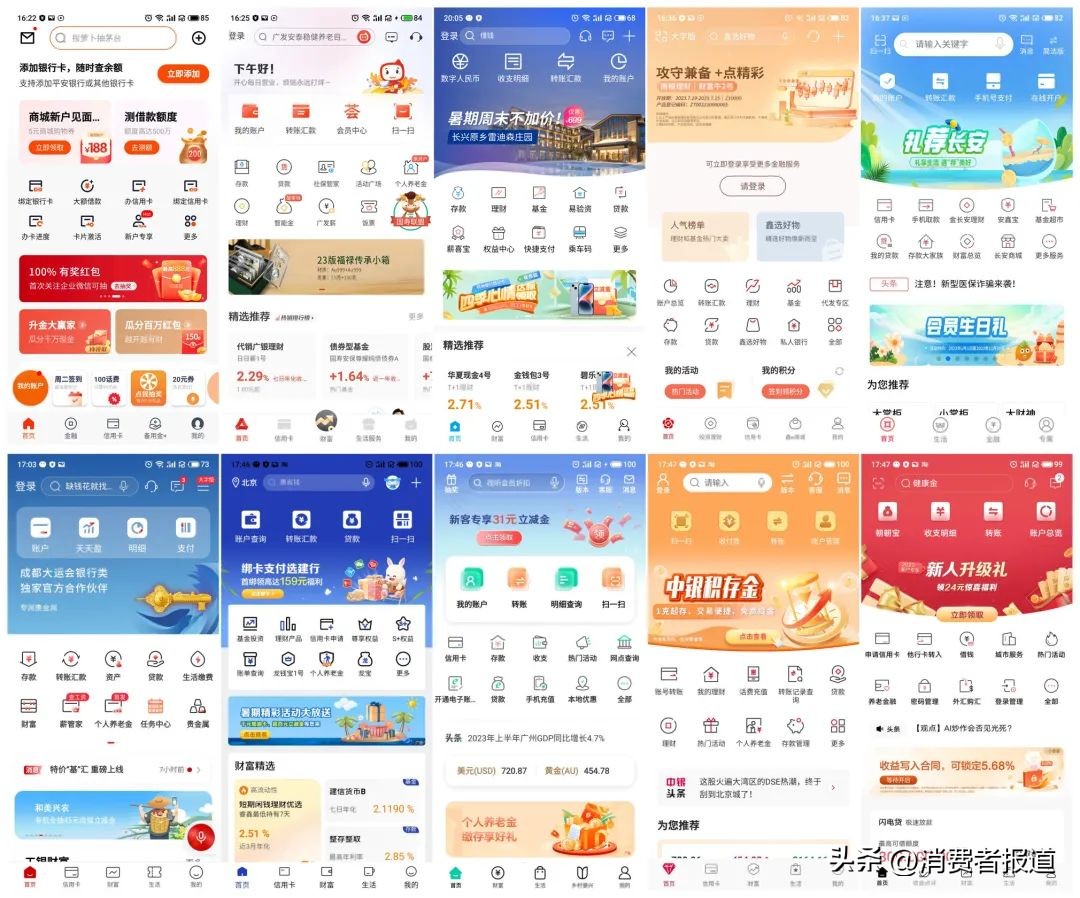 2023年7月,《消费者报道》对10款手机银行App进行了体验和测评。10家手机银行分别为中国工商银行、中国农业银行、中国建设银行、中国银行、招商银行、平安银行、广发银行、杭州银行、南京银行、长安银行,涉及国有大行、股份制银行、城商行。