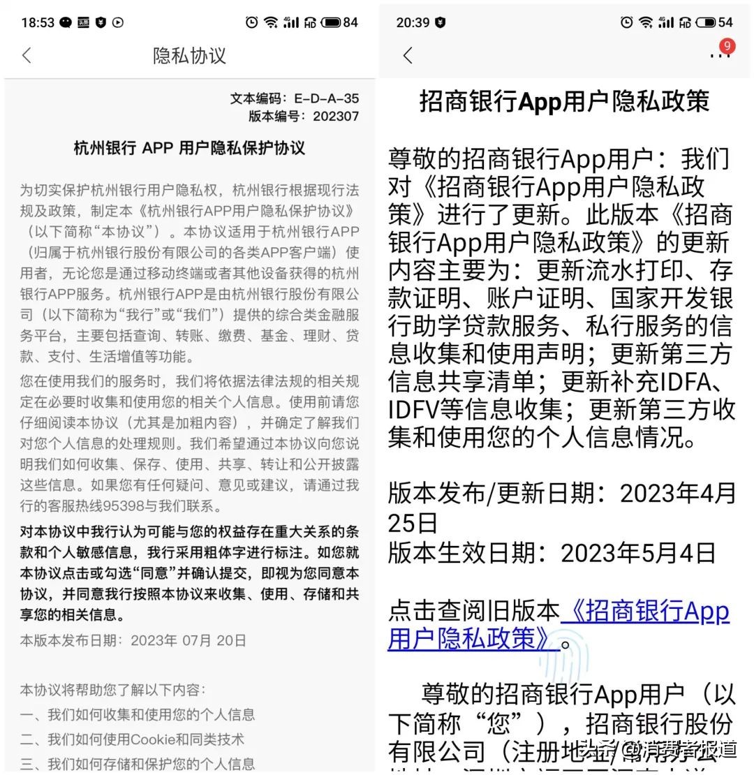 如杭州银行App和招商银行App的手机页面对比,杭州银行的隐私保护协议字体过小过密,颜色过淡,而招商银行字体整体偏大,方便查看阅读。