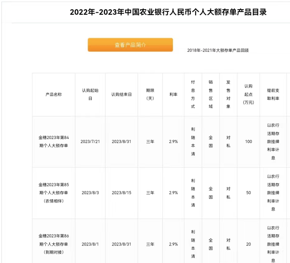 除了考虑普通定期存款之外,大家还可以考虑大额存单,目前农业银行大额存单的利率也不高,三年期大额存单只有2.9%。