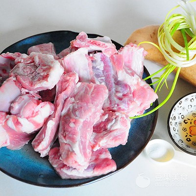 4、泡好的排骨,用开水焯一下,捞出,待用