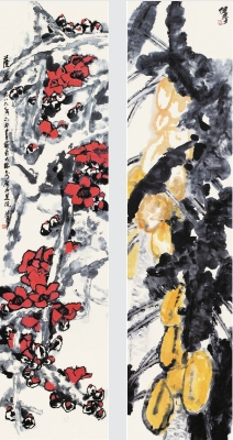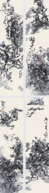 1985年大三分科,广州美术学院首设花鸟画科,方健群被系里选中并任学科代表。1986 年的毕业创作展上,23岁方健群的大写意四条屏《岭南花果·四屏》大获好评,当时被认为“让人看到岭南画派发展的可能性”。