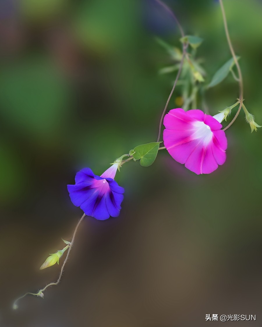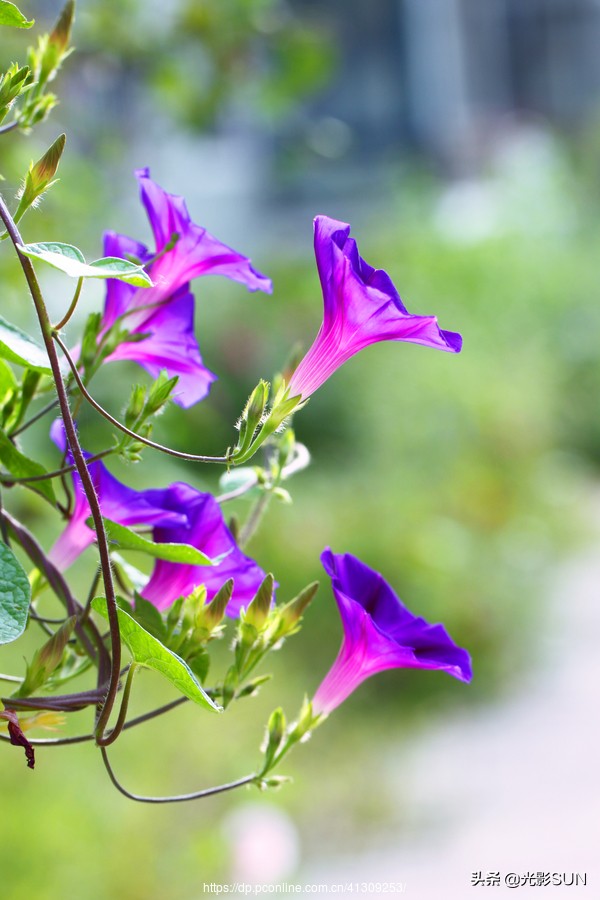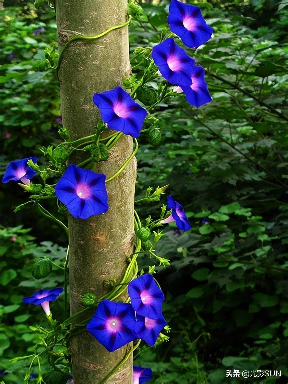 牵牛花,也叫喇叭花,因为它的形状就像一朵喇叭花。为了获得更多的阳光和空间,使其生长发育得更好,它们茎的顶端就紧紧随时朝向东升西落的太阳,称为“转头运动”。