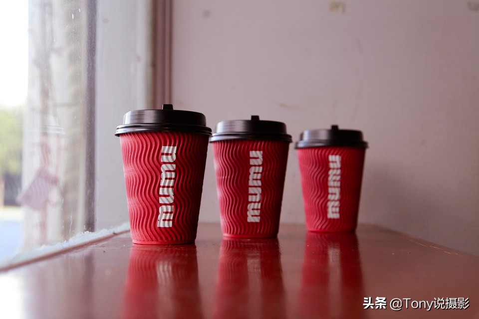 当我们靠近一些拍摄,会发现最后面的小杯子和窗外区域有些模糊,这是因为随着距离靠近,景深范围变小,所以前面两个小杯子会更清晰,而最后一个杯子有些模糊。