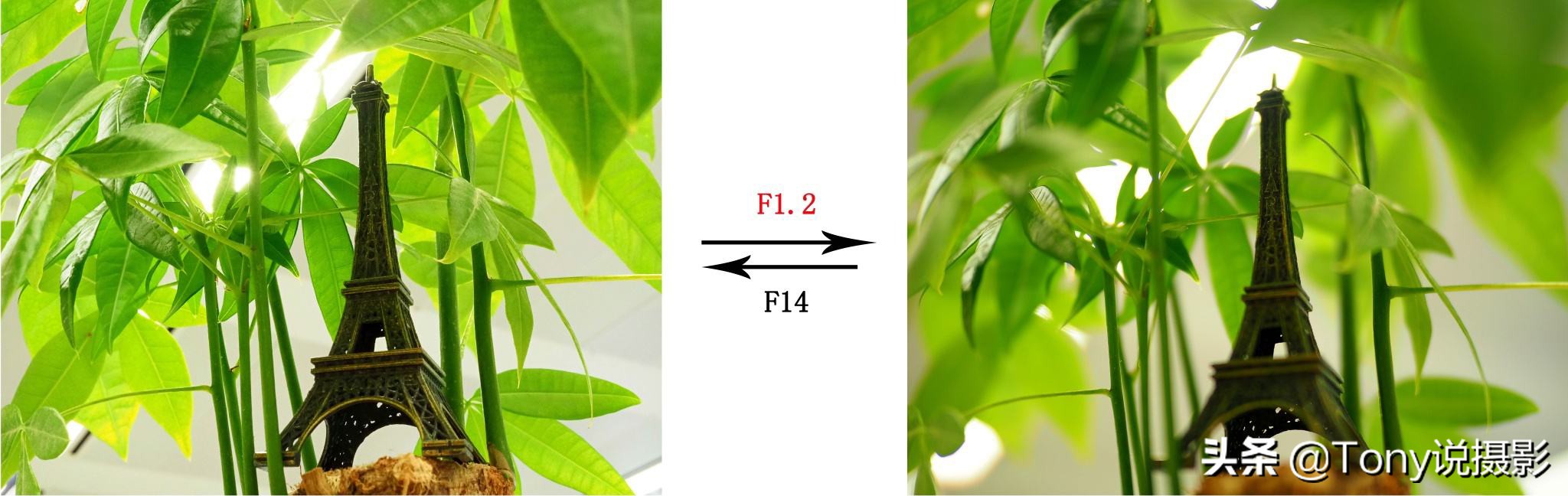 当光圈值为F1.2时,可以明显发现除了小塔及周围的茎叶是清晰的之外,其他区域都趋向于模糊,这是光圈较大,景深范围小,其他画面元素处于清晰范围之外,所以虚化模糊。