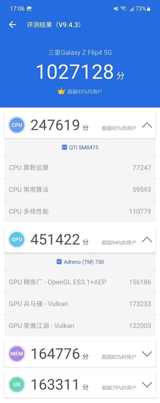 通过最新版本的安兔兔评测,搭载了骁龙8+处理器的三星Galaxy Z Flip4获得了102万分的成绩,对于折叠屏产品来说表现还是不错的。