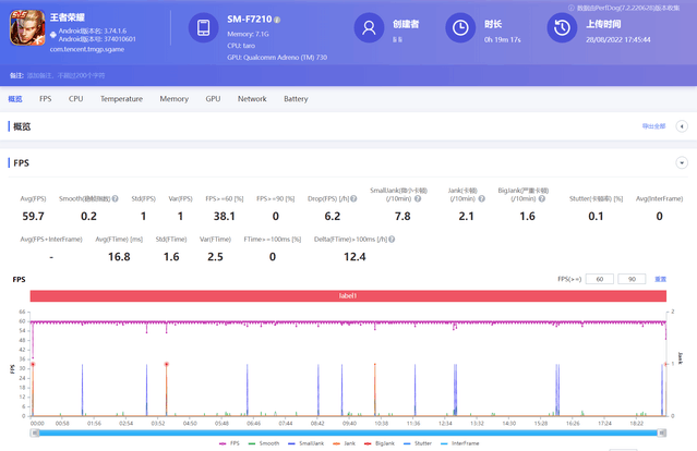 首先是《王者荣耀》的测试,由于目前三星Galaxy Z Flip4尚未适配《王者荣耀》的高帧率模式,所以只能以高帧率(60帧)模式进行测试,这对于三星Galaxy Z Flip4应该是小菜一碟。从帧率曲线我们也能看到,整局游戏流畅、稳定,体验十分不错。
