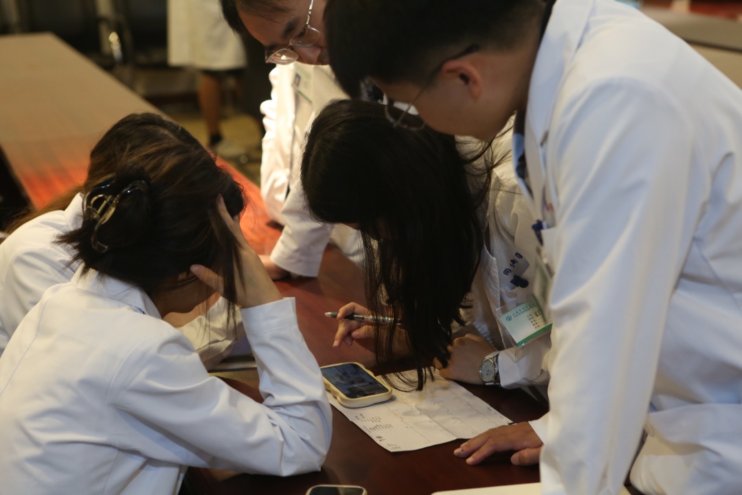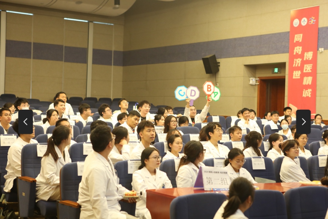 临床能力比赛强调人人参与。学员以小组为单位进行“知识竞赛”,题目包括入院教育内容、临床知识、技能展示、医院环境与流程、规培要求等,题材广泛。比赛设置了个人必答题、小组合作题、抢答风险题、幸运抽签、“你做我猜”、“卓越之星”等多个环节,以赛促学,以赛识君。现场气氛紧张热烈,每位学员都精神饱满,为队友加油,为对手喝彩,在欢声笑语中携手共进。