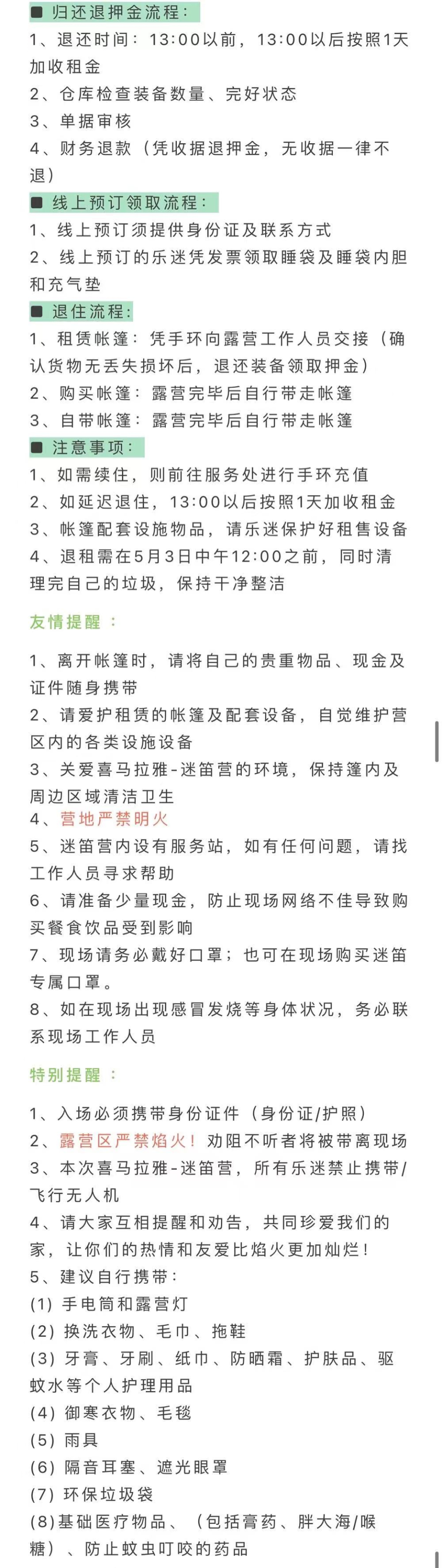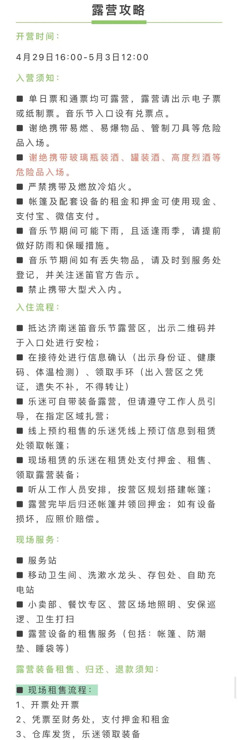 济南迷笛音乐节的乐迷们可以4月30日16时至5月3日12时之间开营,单日票、通票均可露营;可自带露营装备,也可以线上预约租售、现场租赁;露营区设有服务站,提供有偿热水淋浴(10元/次),移动卫生间、洗漱水龙头、存包处、自助充电站等。
